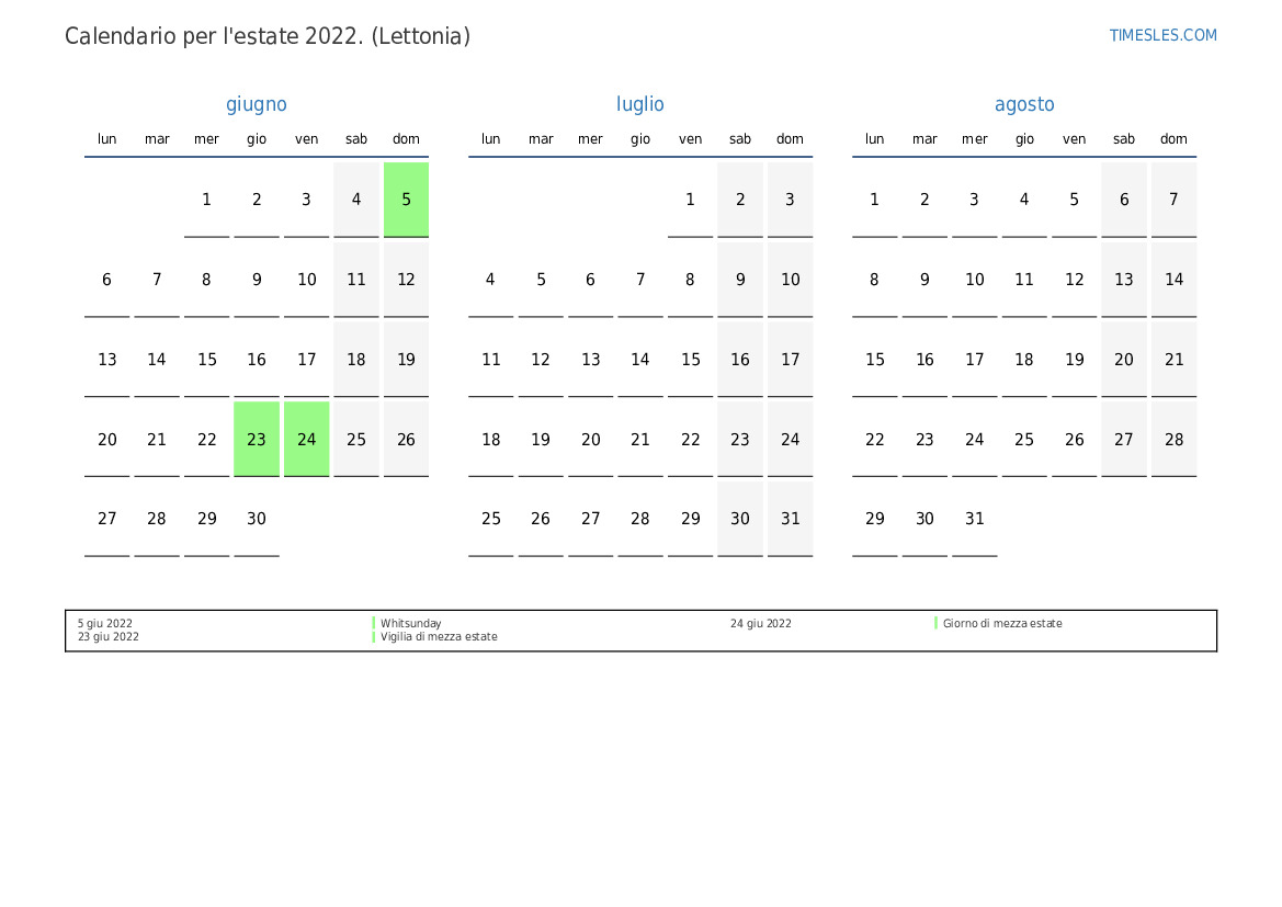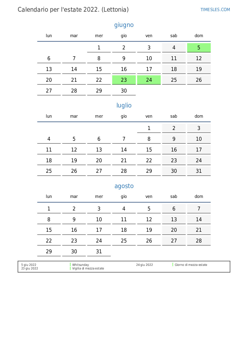 Scarica e stampa il calendario PDF con i giorni festivi e i fine settimana per l'estate 2022per la Lettonia