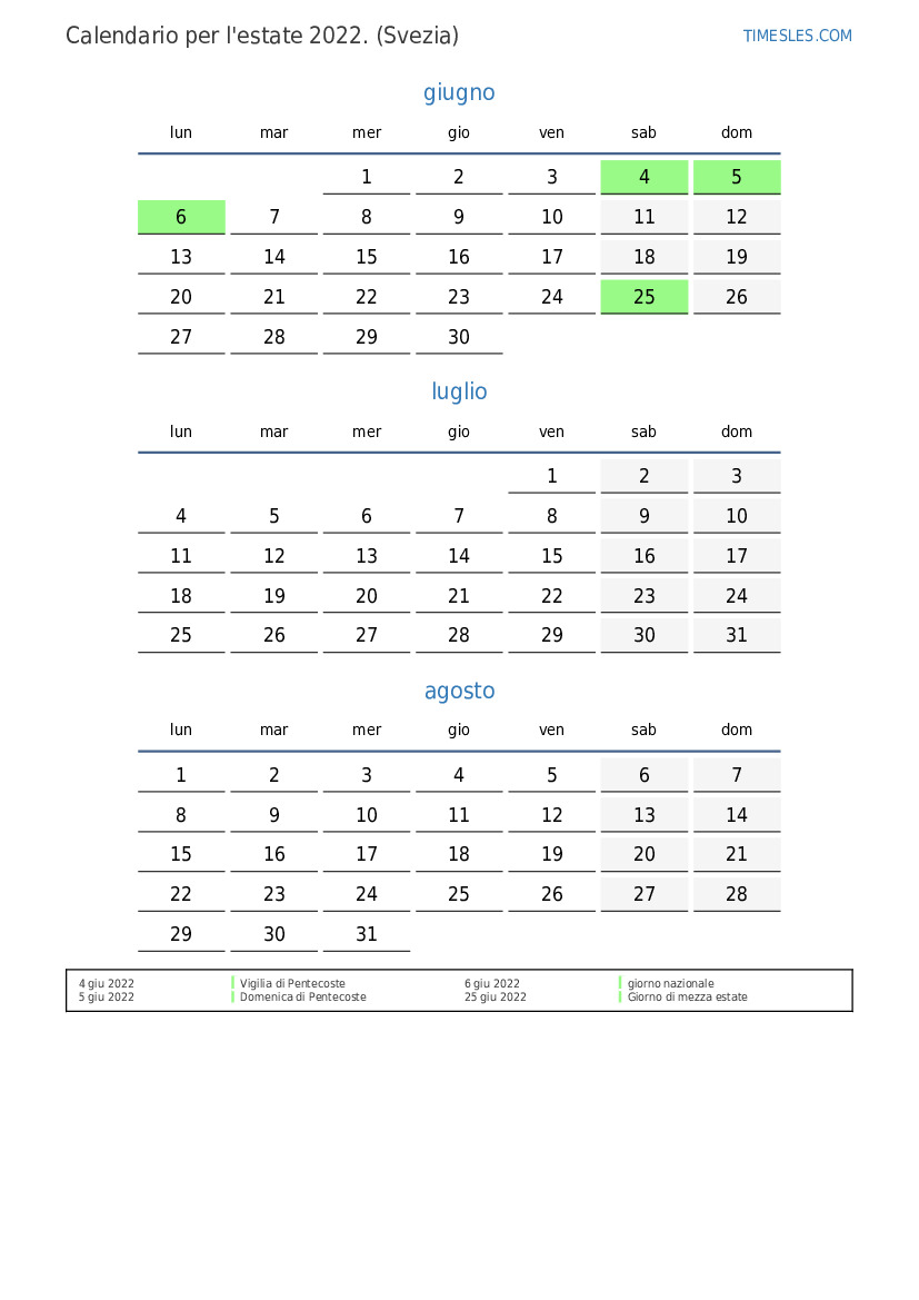 Scarica e stampa il calendario PDF con i giorni festivi e i fine settimana per l'estate 2022per la Svezia
