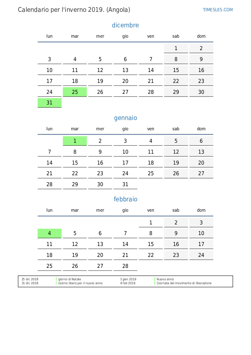 Scarica e stampa il calendario PDF con i giorni festivi e i fine settimana per l'inverno 2019per l'Angola