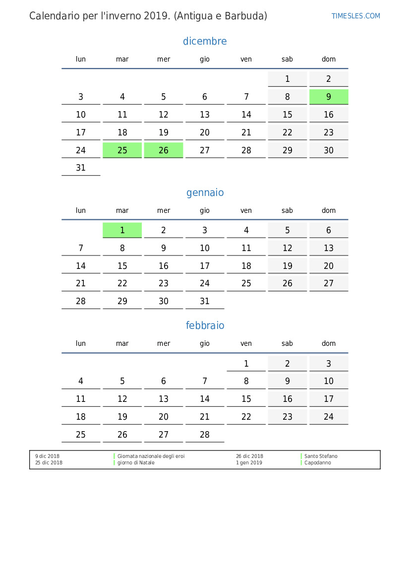 Calendario per l'inverno 2019 per Antigua e Barbuda