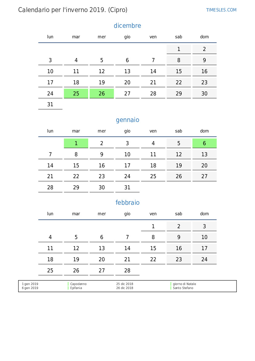 Scarica e stampa il calendario PDF con i giorni festivi e i fine settimana per l'inverno 2019per Cipro