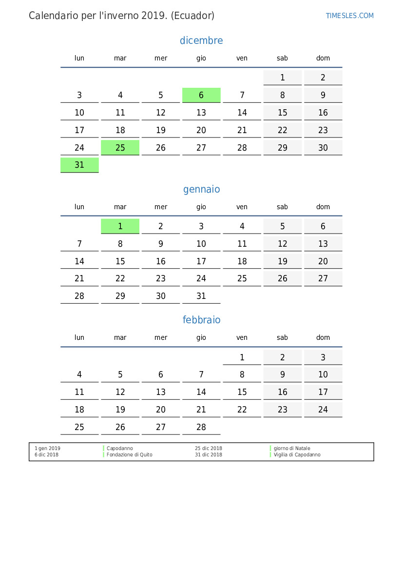 Scarica e stampa il calendario PDF con i giorni festivi e i fine settimana per l'inverno 2019per l'Ecuador