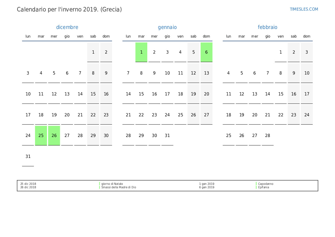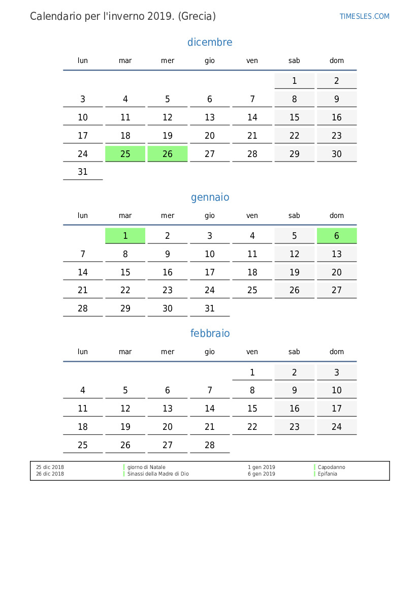 Scarica e stampa il calendario PDF con i giorni festivi e i fine settimana per l'inverno 2019per la Grecia