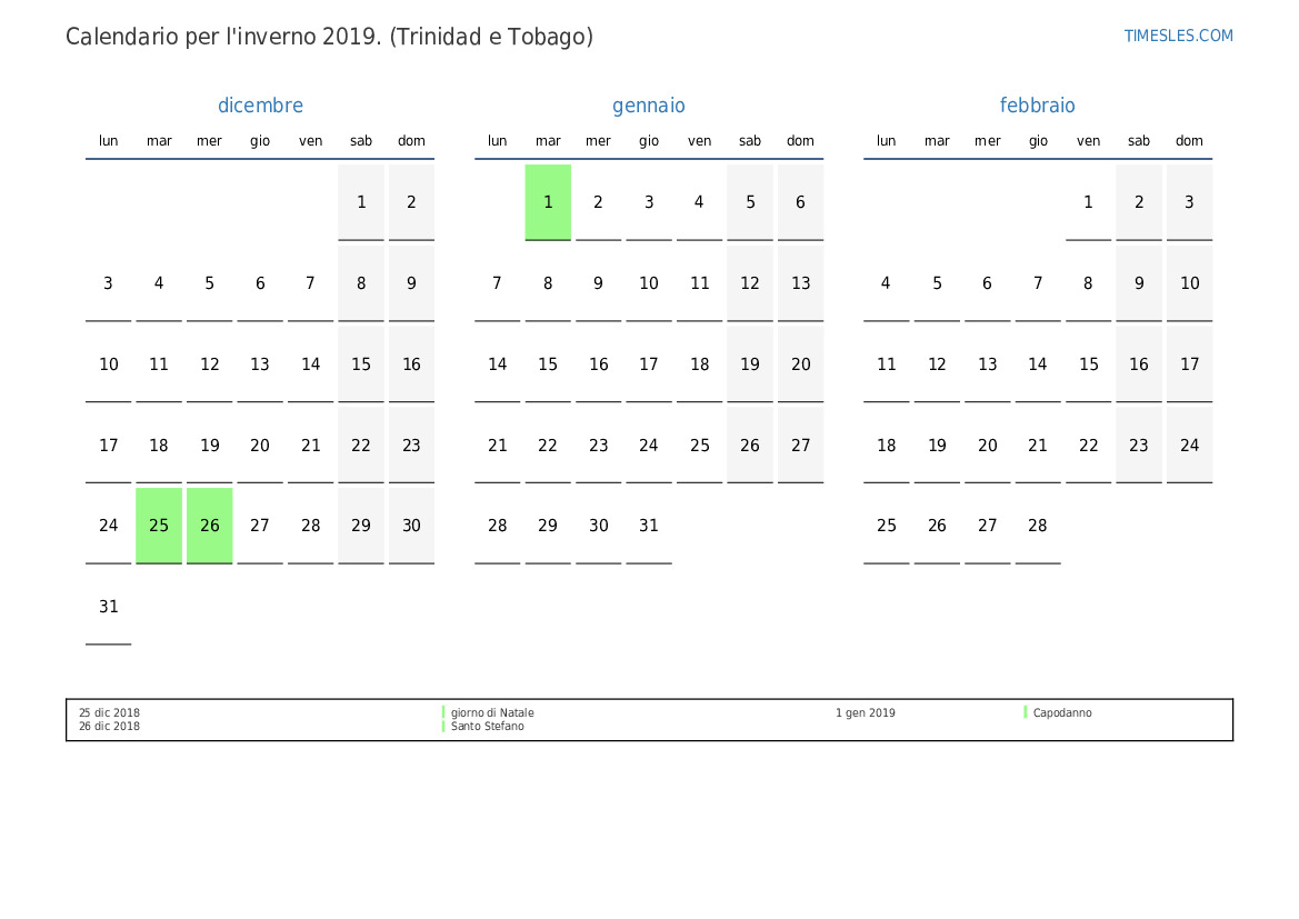 Calendario per l'inverno 2019 per Trinidad e Tobago