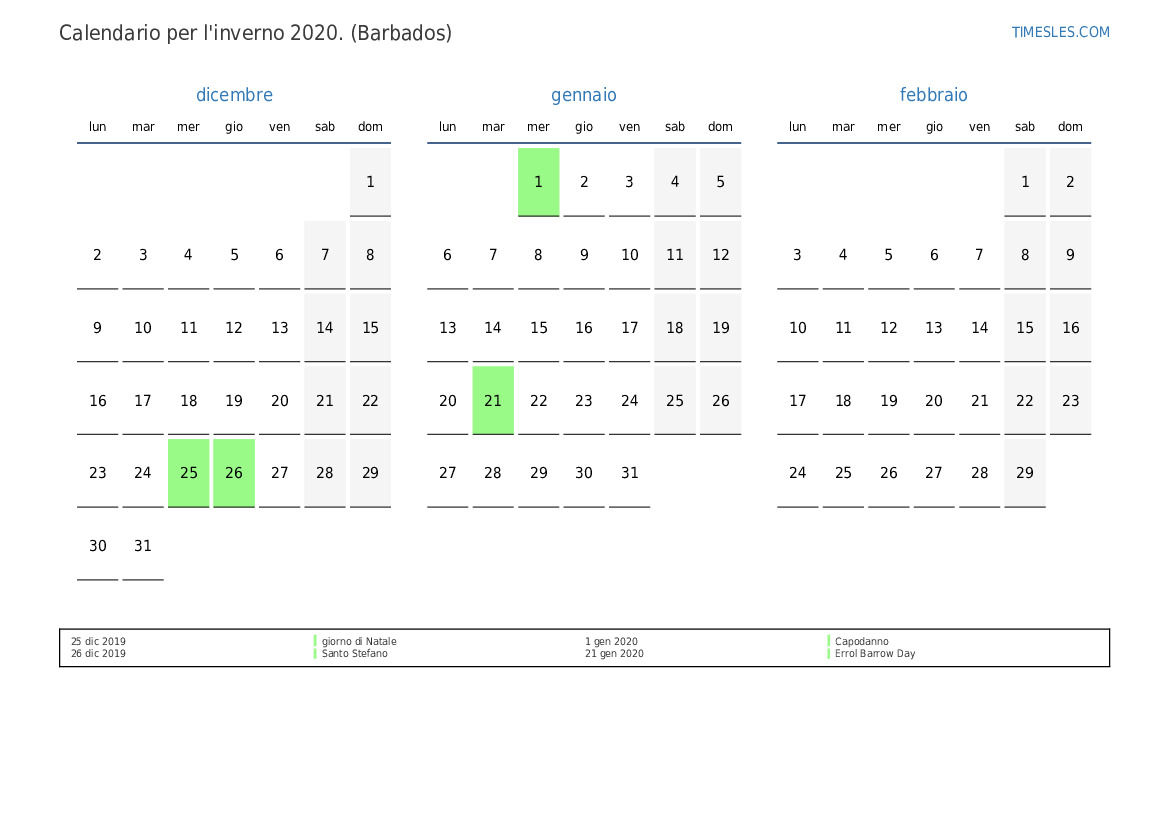 Scarica e stampa il calendario PDF con i giorni festivi e i fine settimana per l'inverno 2020per Barbados