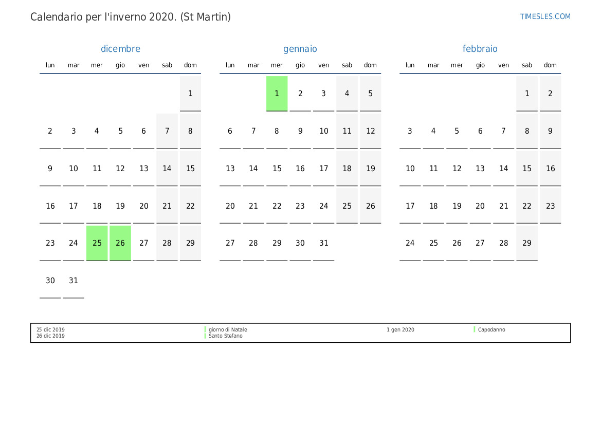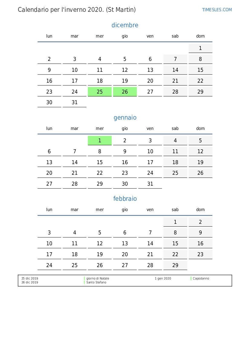 Scarica e stampa il calendario PDF con i giorni festivi e i fine settimana per l'inverno 2020per Sint Maarten