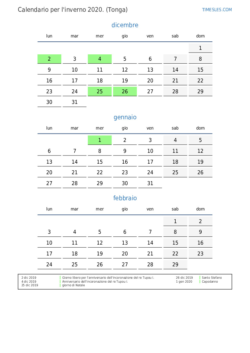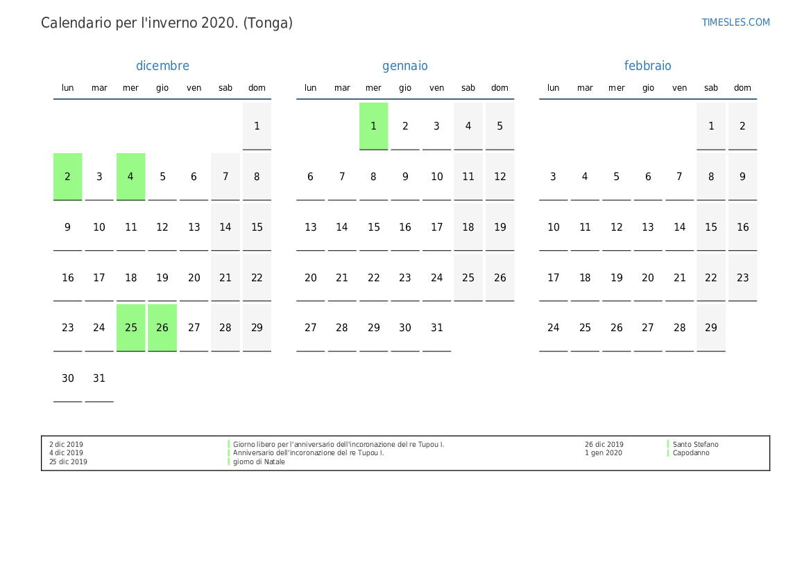 Scarica e stampa il calendario PDF con i giorni festivi e i fine settimana per l'inverno 2020per Tonga