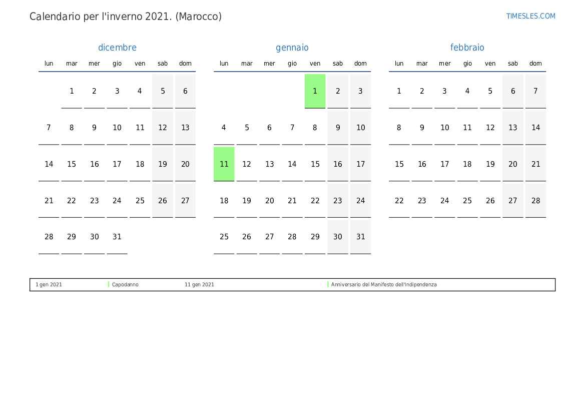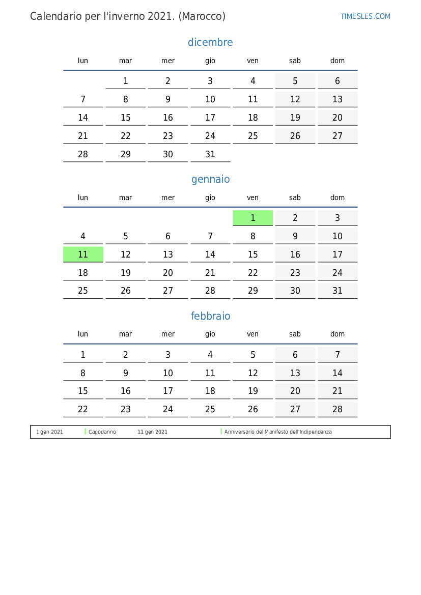 Scarica e stampa il calendario PDF con i giorni festivi e i fine settimana per l'inverno 2021per il Marocco