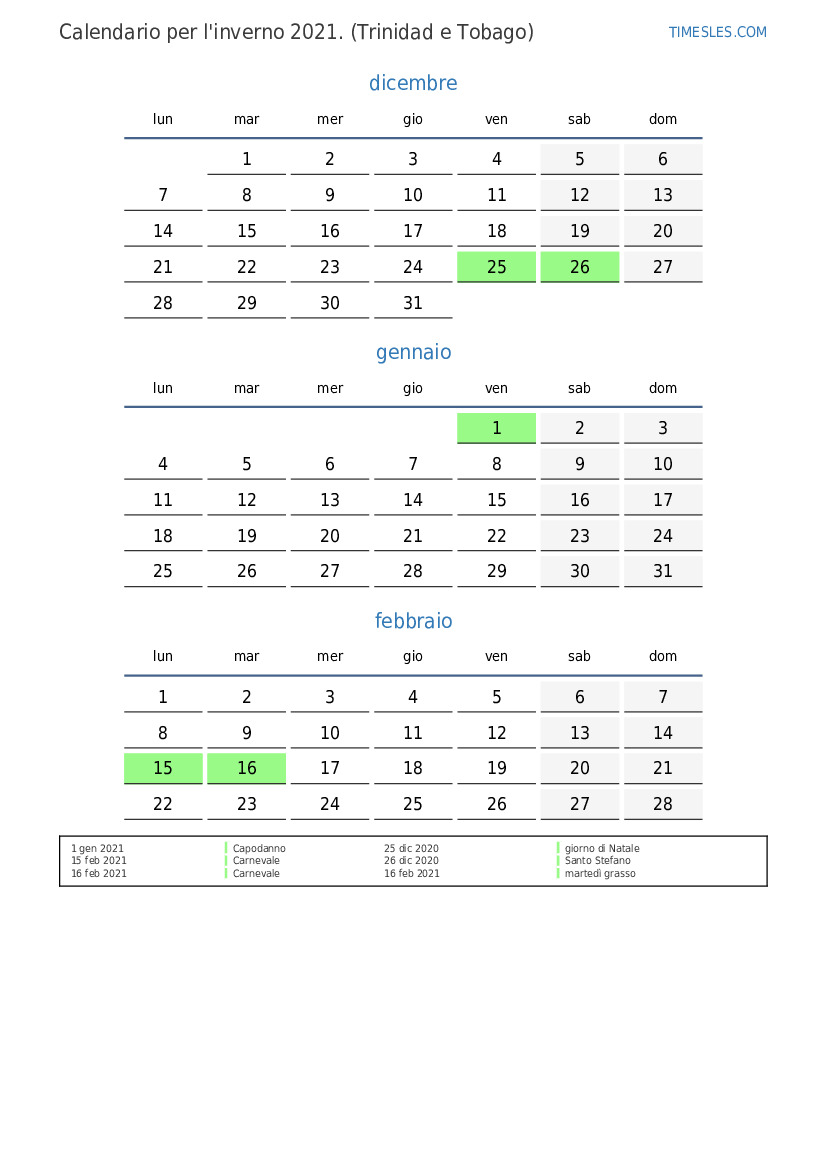 Scarica e stampa il calendario PDF con i giorni festivi e i fine settimana per l'inverno 2021per Trinidad e Tobago