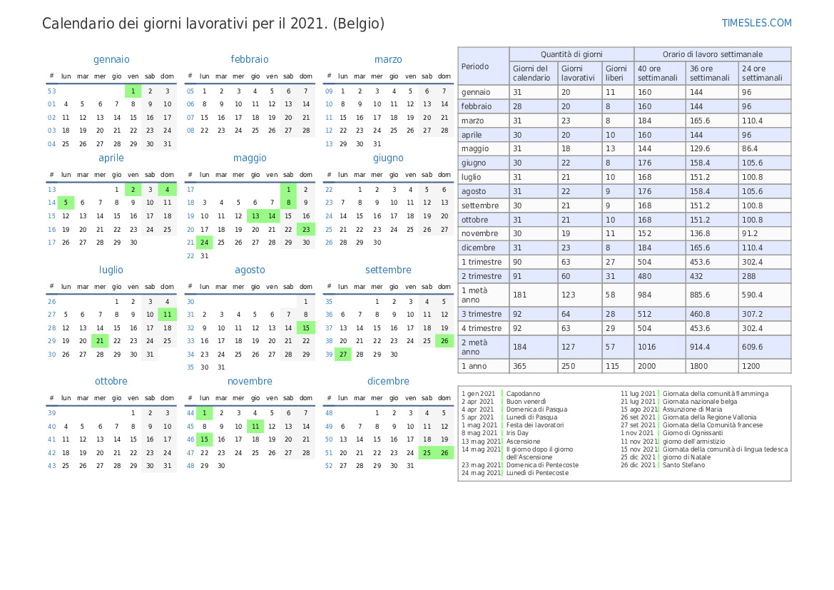 Giorni lavorativi per dicembre 2021 per il Belgio