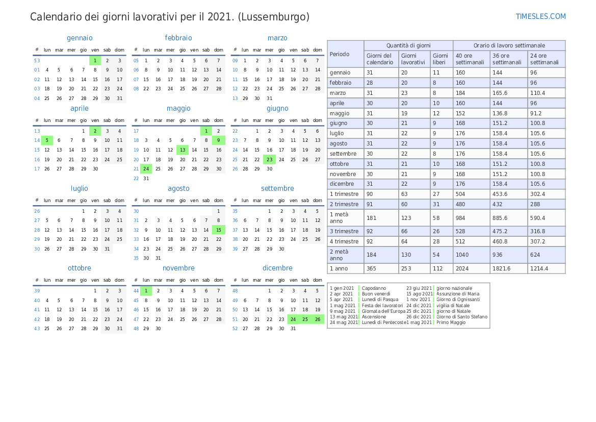 Scarica e stampa il calendario dei giorni lavorativi in formato PDF per dicembre 2021 per il Lussemburgo