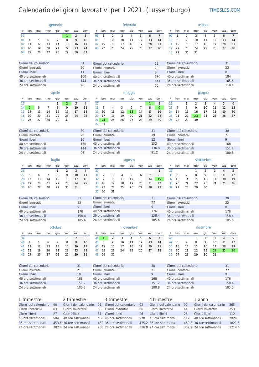 Giorni lavorativi per dicembre 2021 per il Lussemburgo