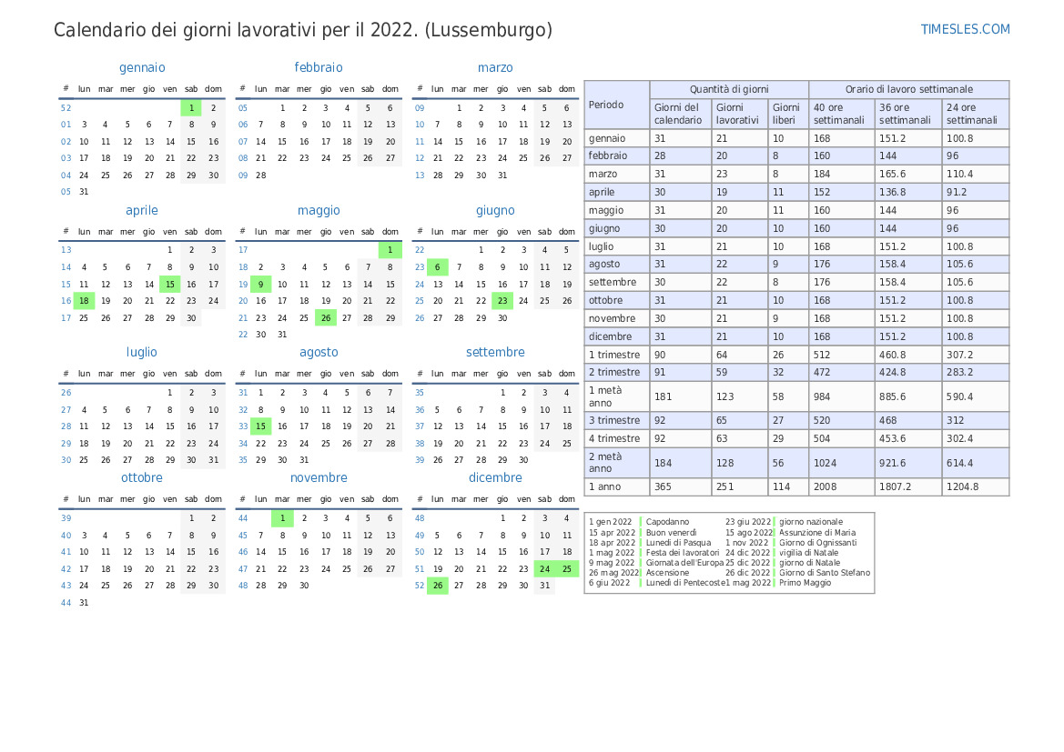 Calendario dei giorni lavorativi per gennaio 2022 per il Lussemburgo