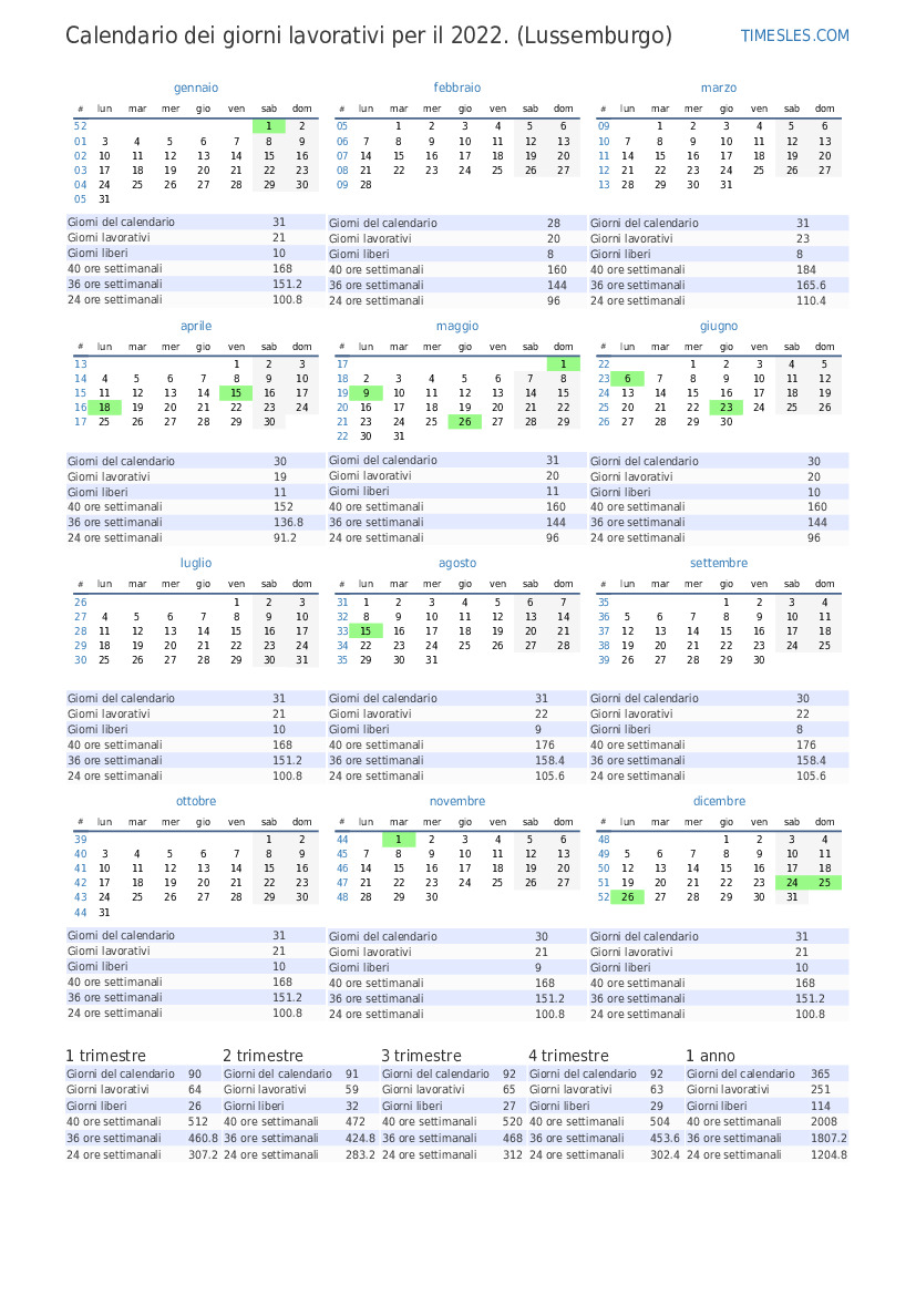 Giorni lavorativi per gennaio 2022 per il Lussemburgo