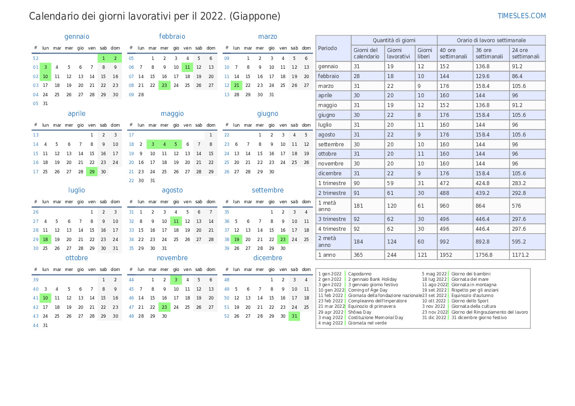 Scarica e stampa il calendario dei giorni lavorativi in formato PDF per agosto 2022 per il Giappone