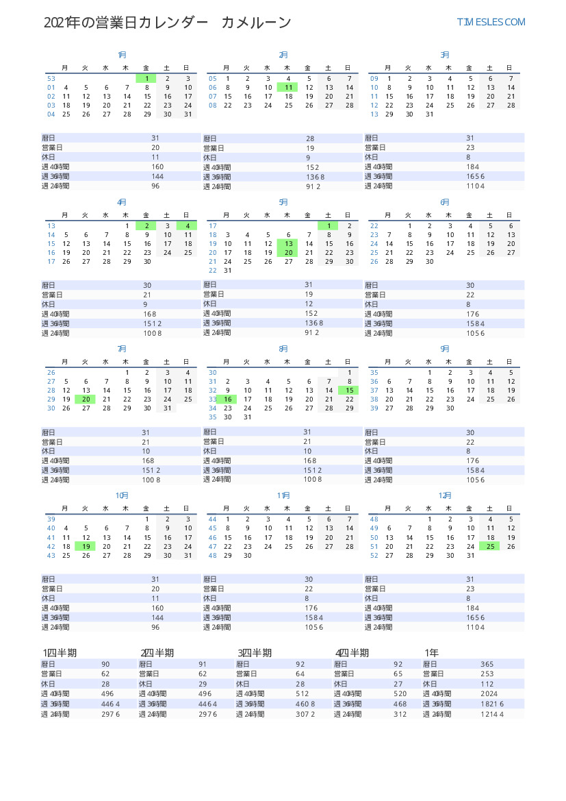カメルーン向け2021年1月の休日と週末の営業日カレンダー