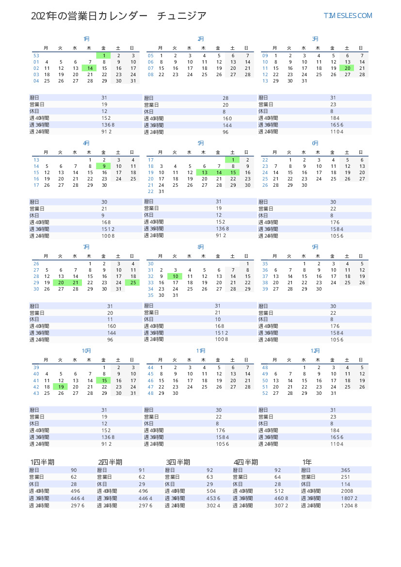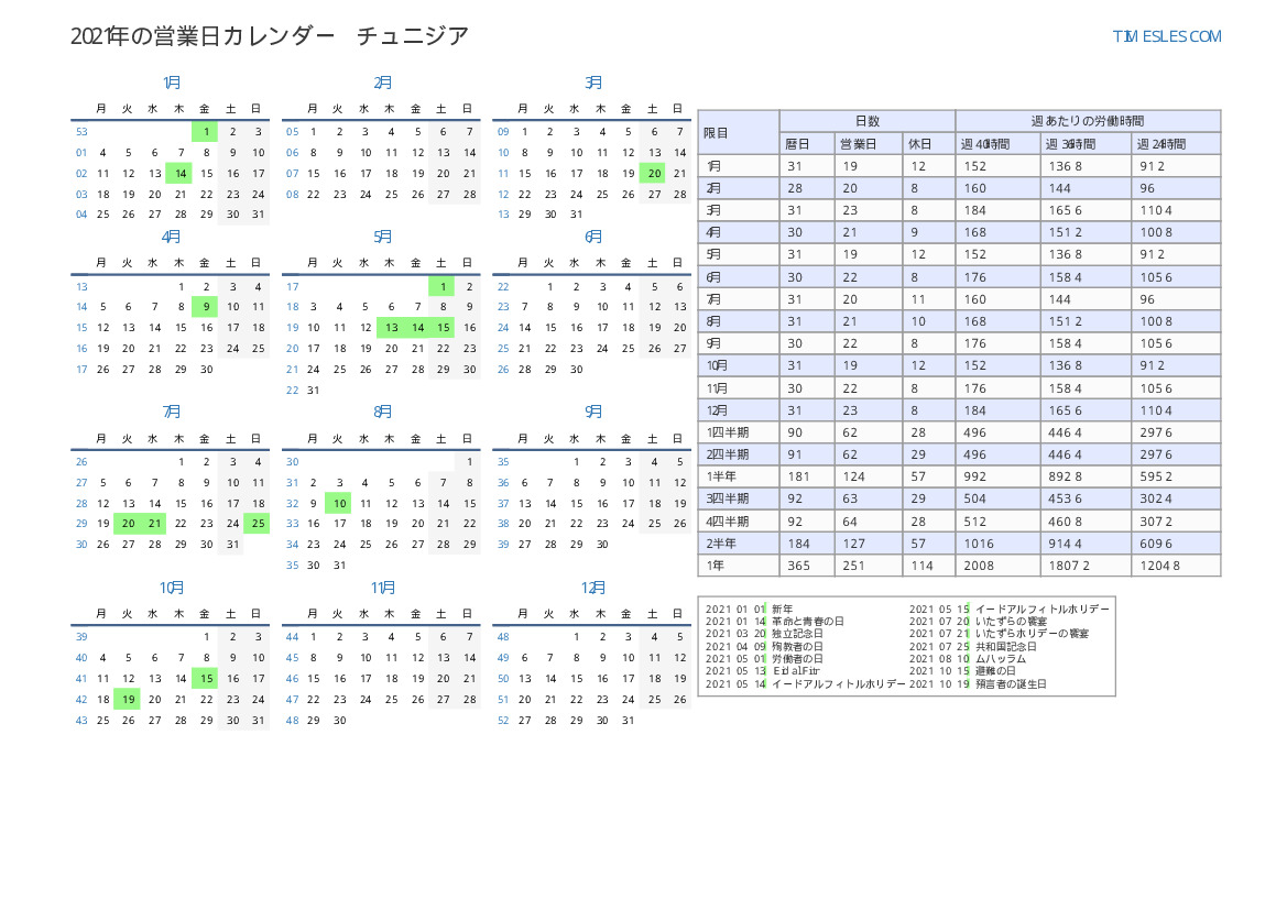 チュニジア向け2021年12月の休日と週末の営業日カレンダー