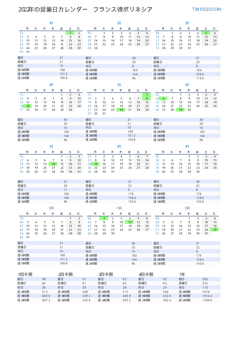 フランス領ポリネシア向け2022年6月の営業日カレンダー