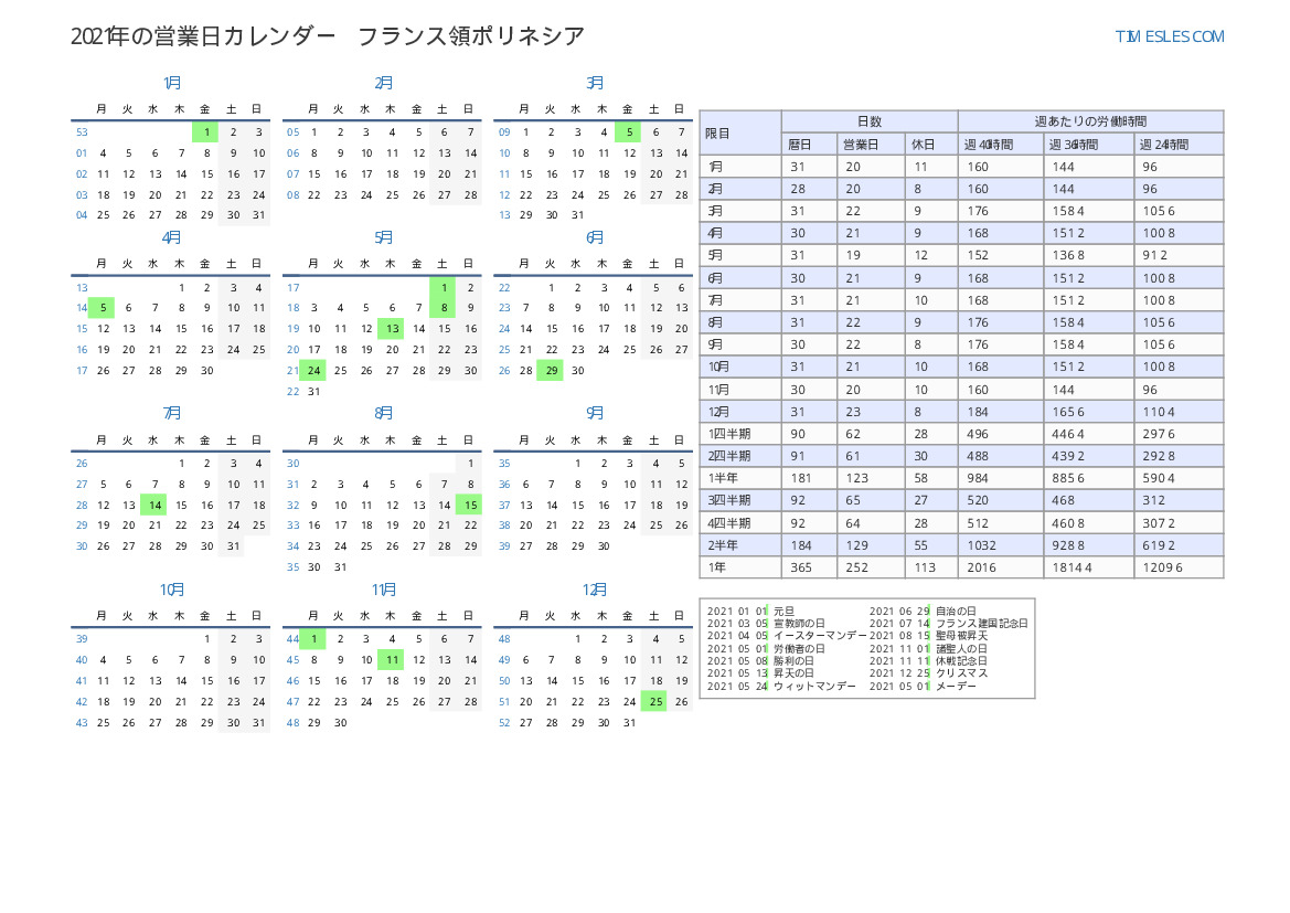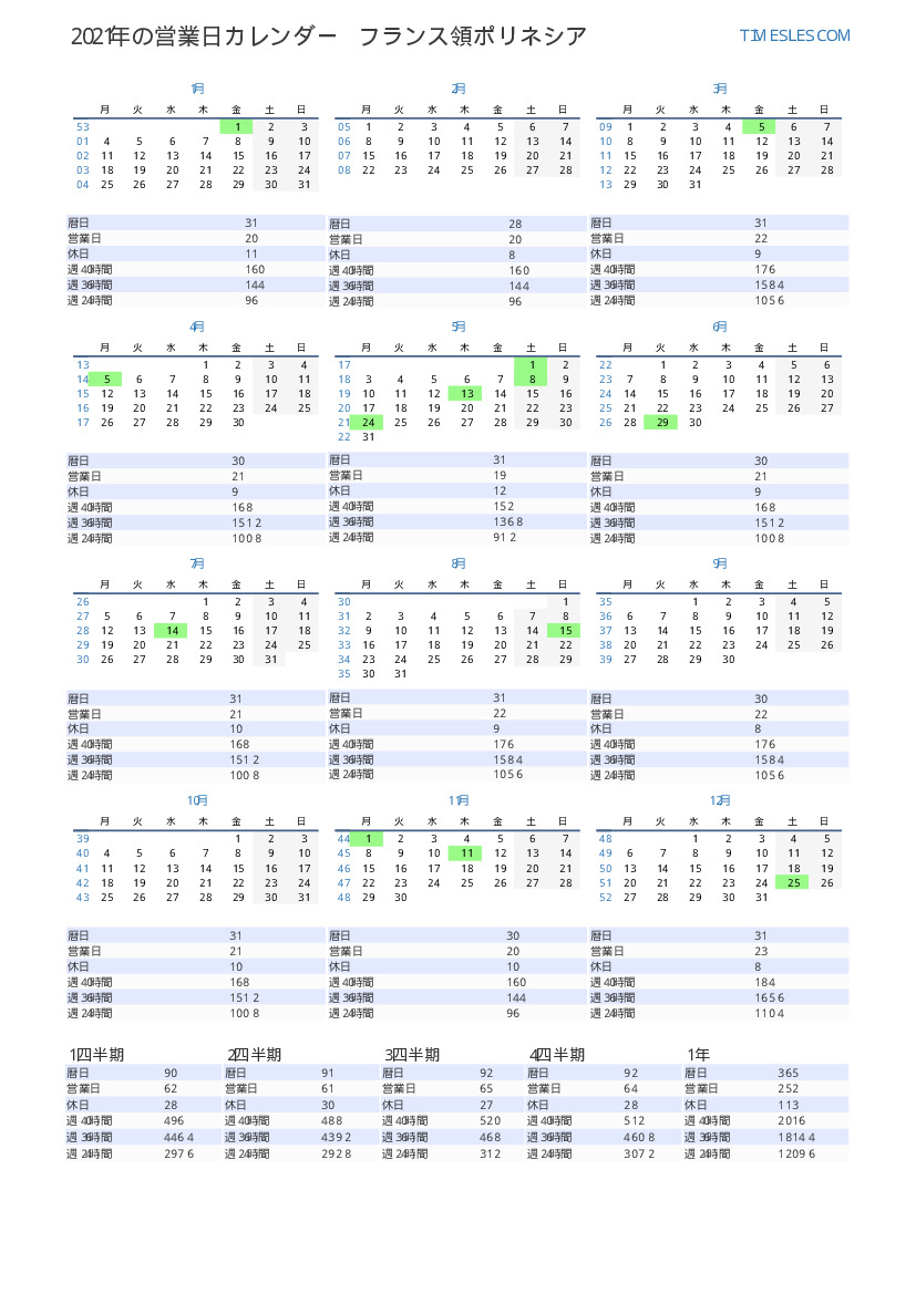 フランス領ポリネシア向け2021年第2四半期の休日と週末の営業日カレンダー