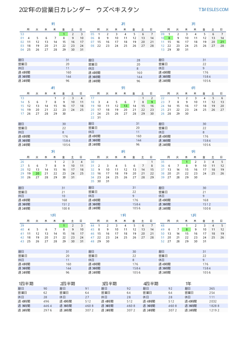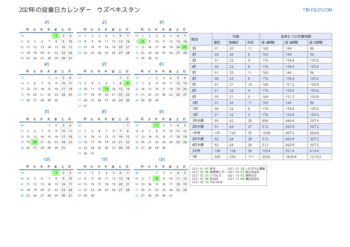 ウズベキスタン向け2021年第2四半期の休日と週末の営業日カレンダー