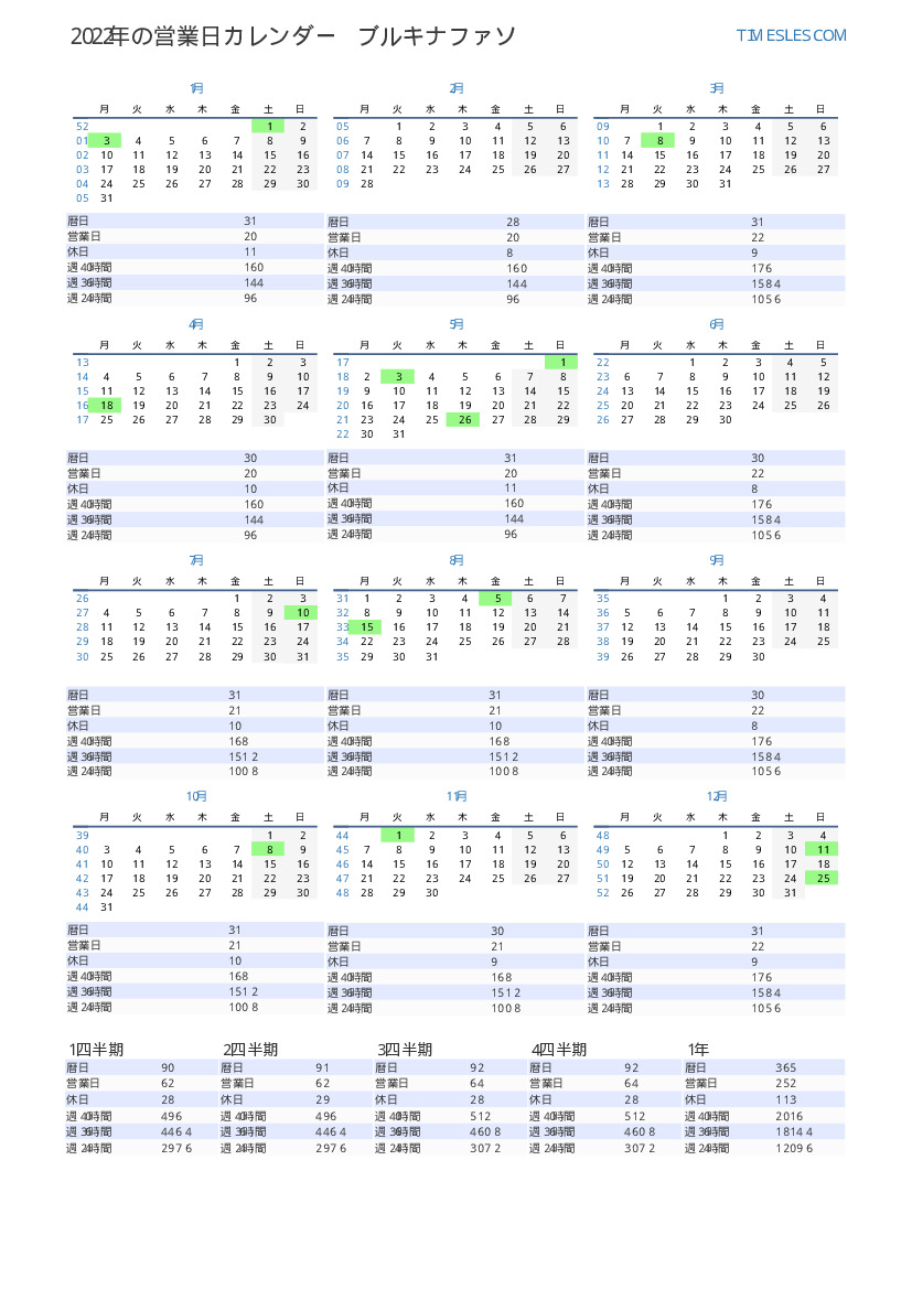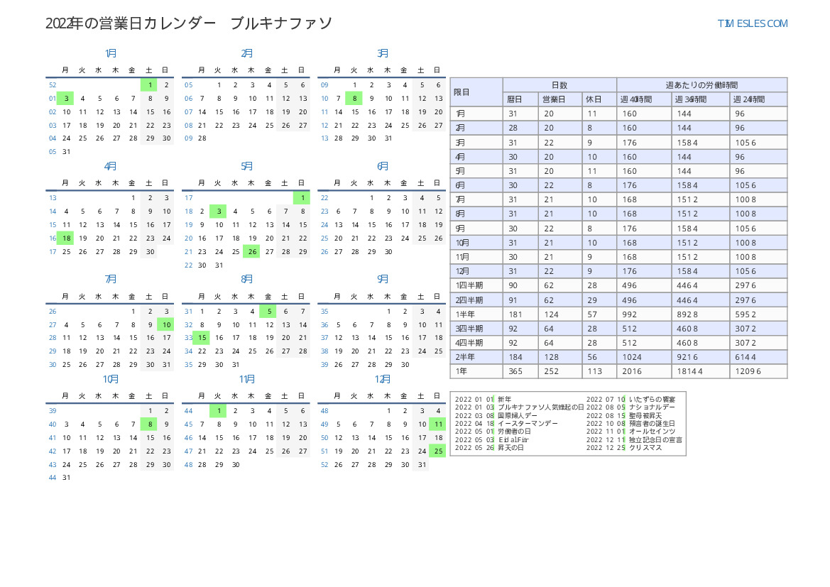 ブルキナファソ2022年第1四半期の休日と週末の営業日カレンダー