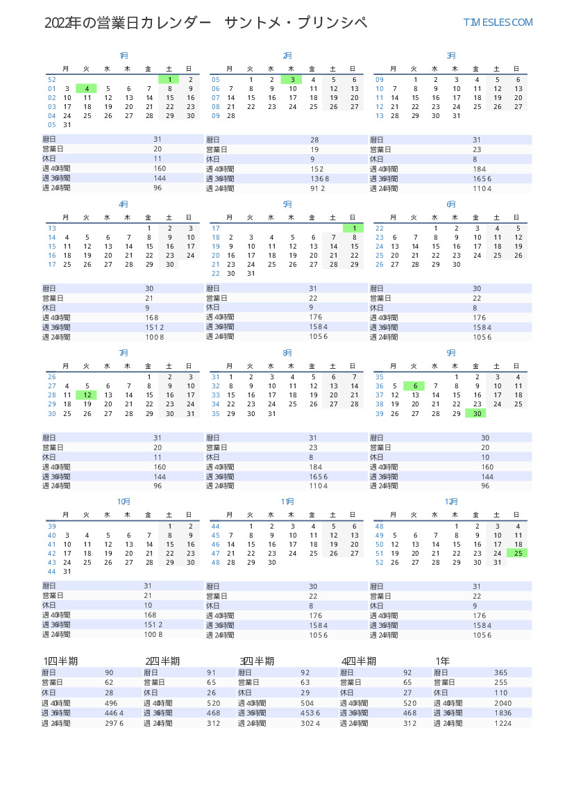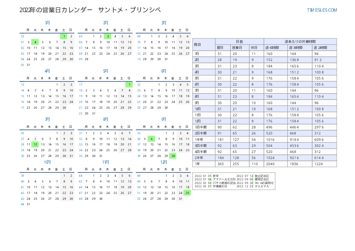 サントメ・プリンシペ2022年第4四半期の休日と週末の営業日カレンダー