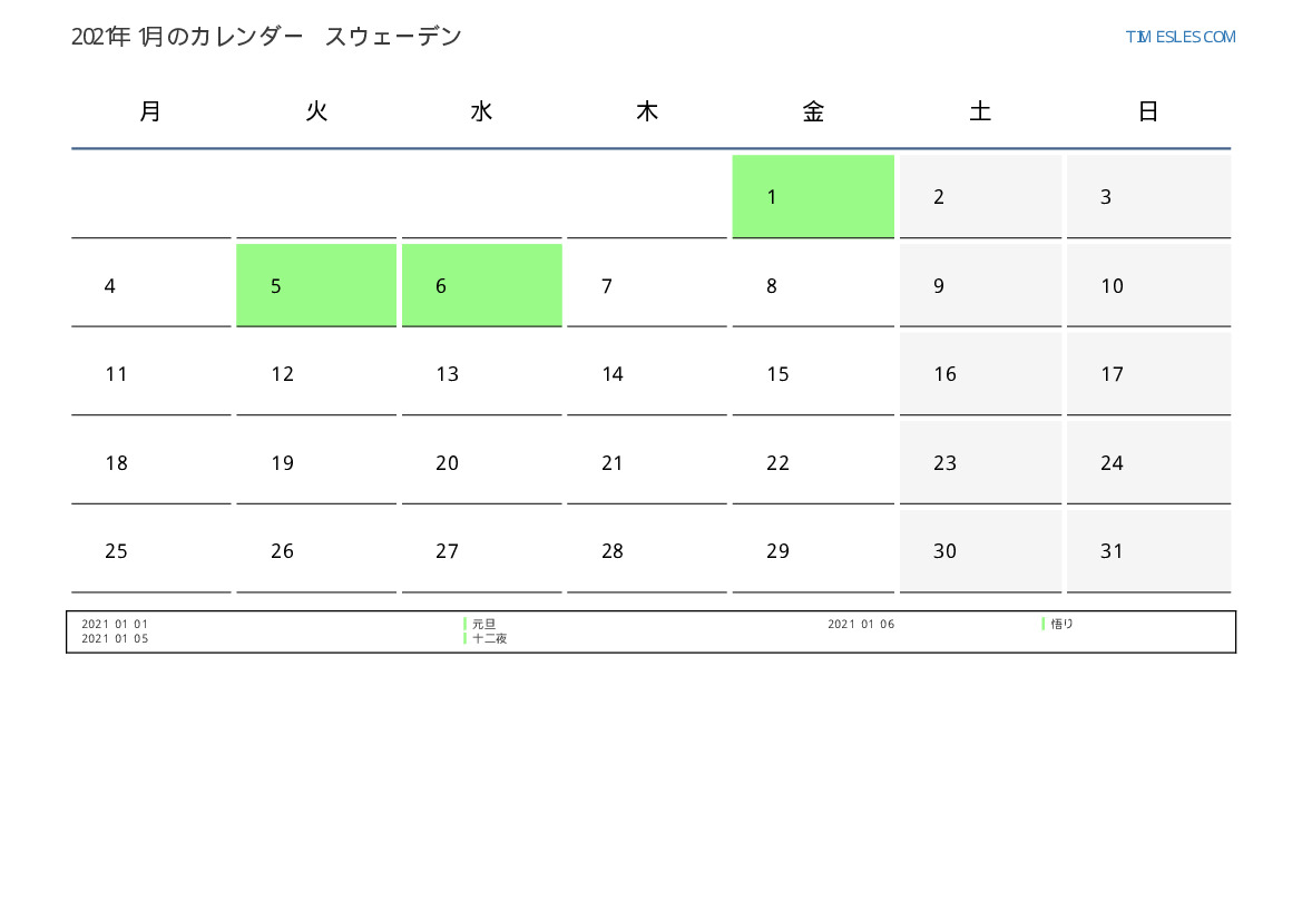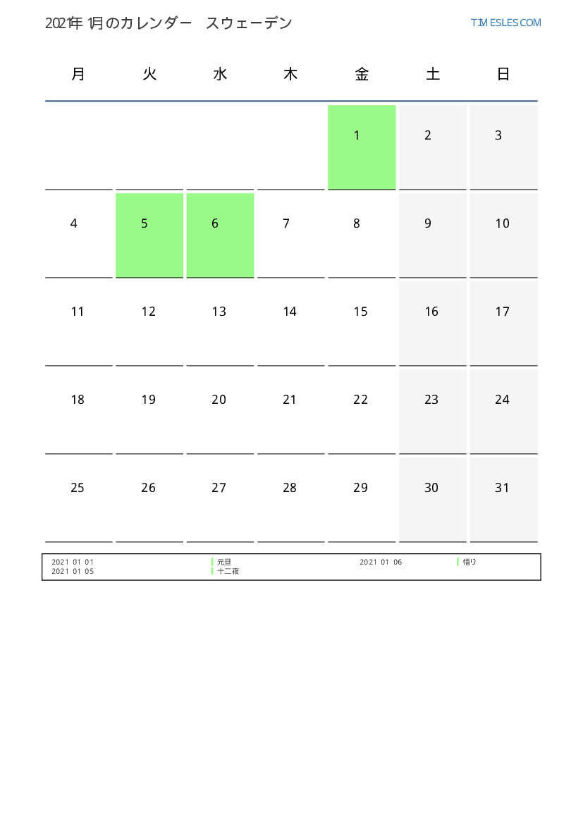 スウェーデン向け2021年1月の休日と週末のカレンダー