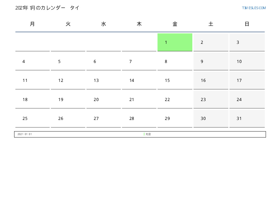 1月には31日が含まれます。 これは2021年の1か月です。一年の季節:冬。 1月は金曜日に始まり、日曜日に終わります。 2021年1月、タイで3 休日と休日があります。
