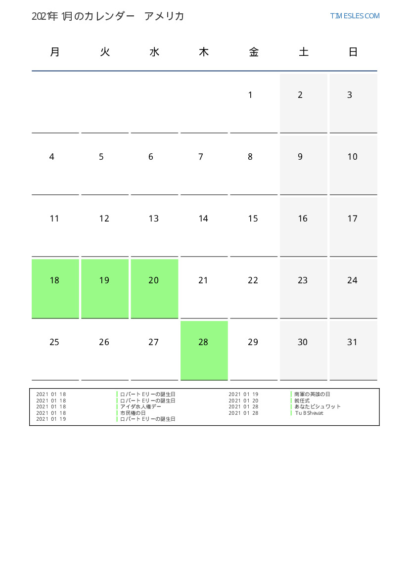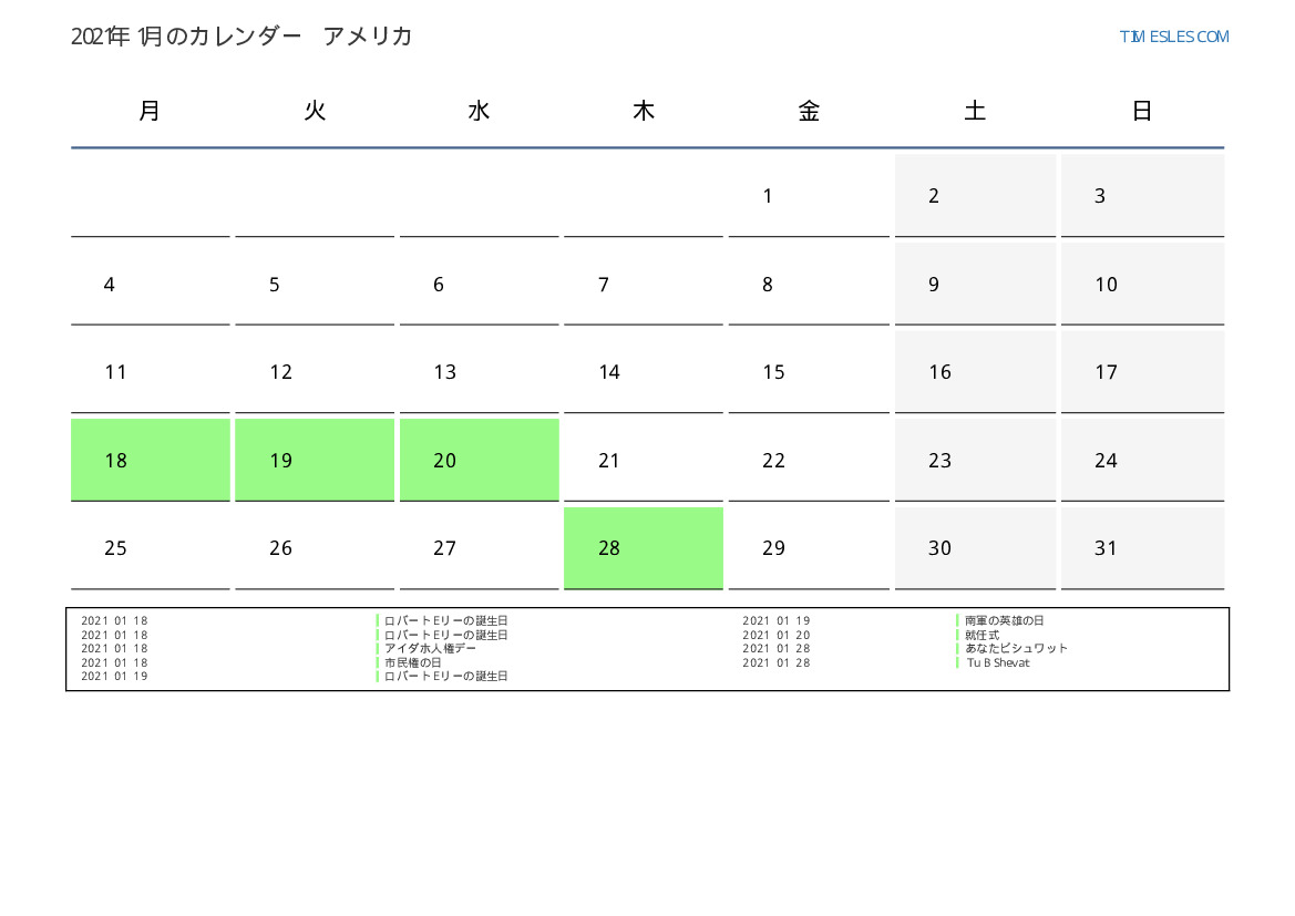 米国向け2021年1月の休日と週末のPDFカレンダーをダウンロードして印刷します