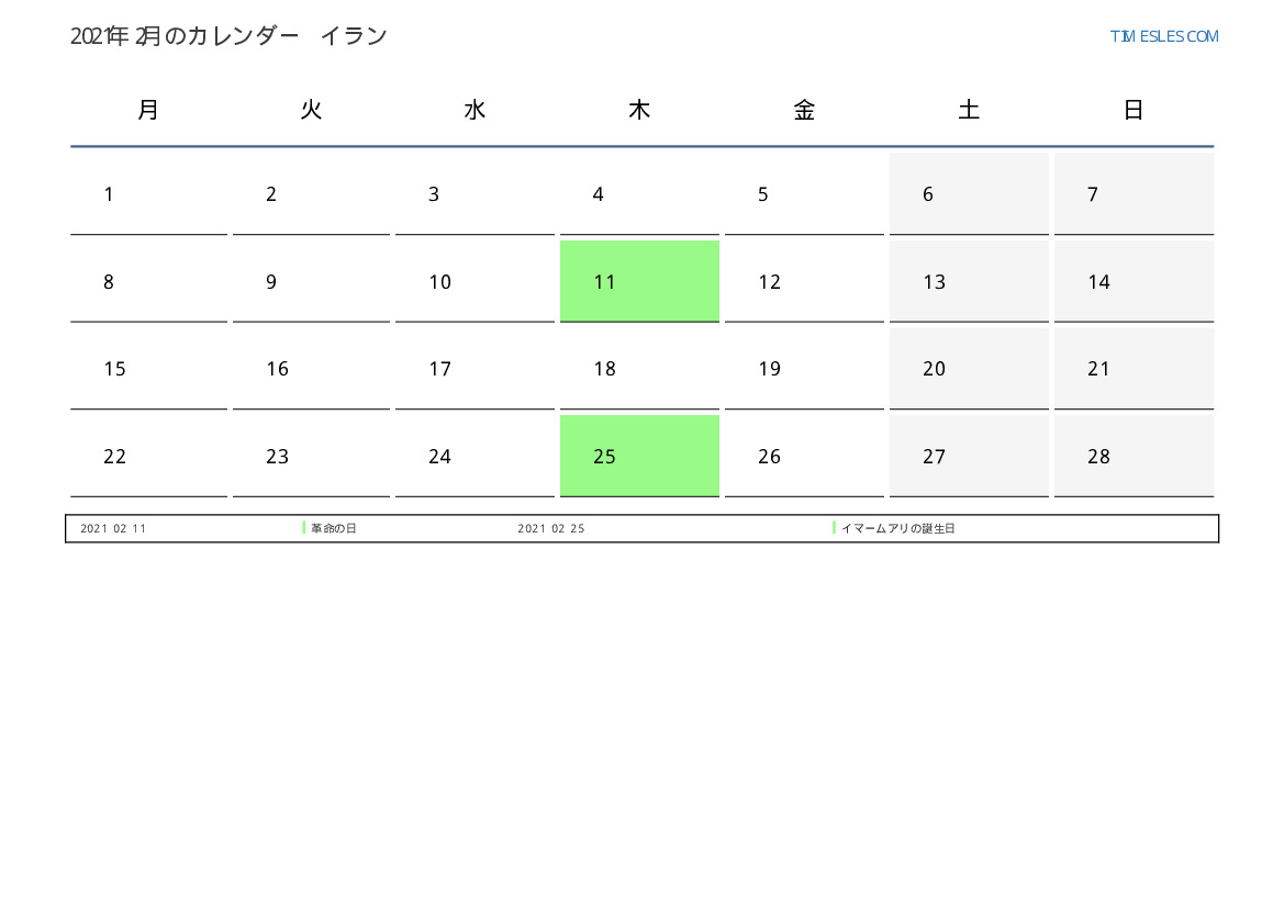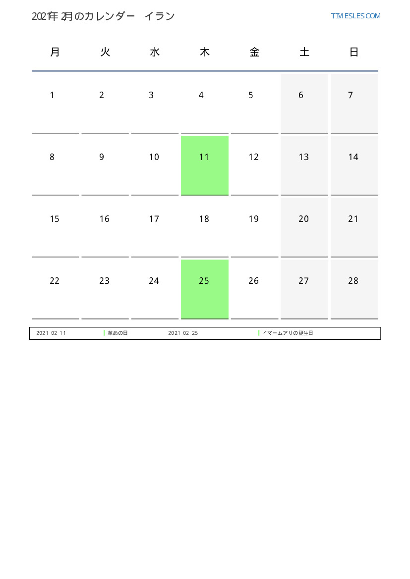 イランのために2021年2月の休日と週末のPDFカレンダーをダウンロードして印刷します