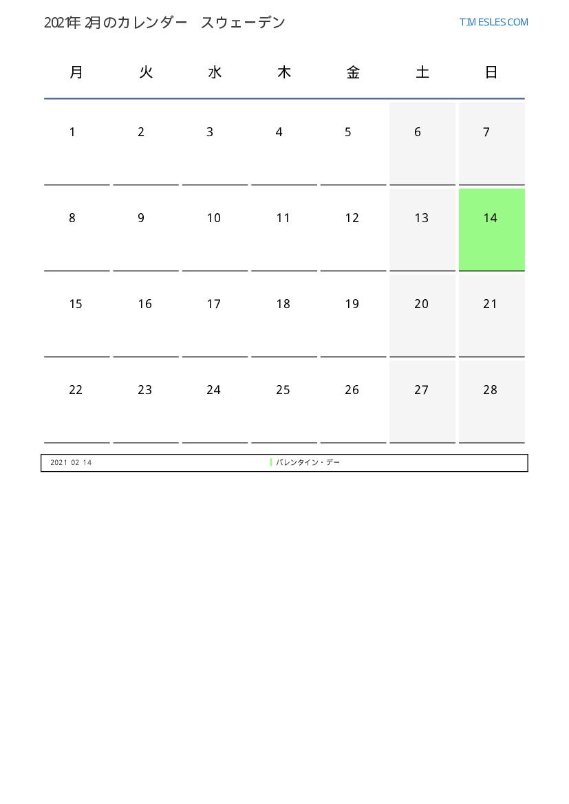スウェーデン向け2021年2月の休日と週末のカレンダー