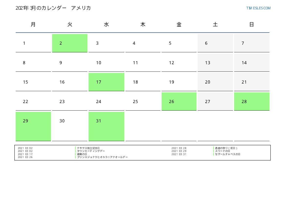 米国向け2021年3月の休日と週末のPDFカレンダーをダウンロードして印刷します