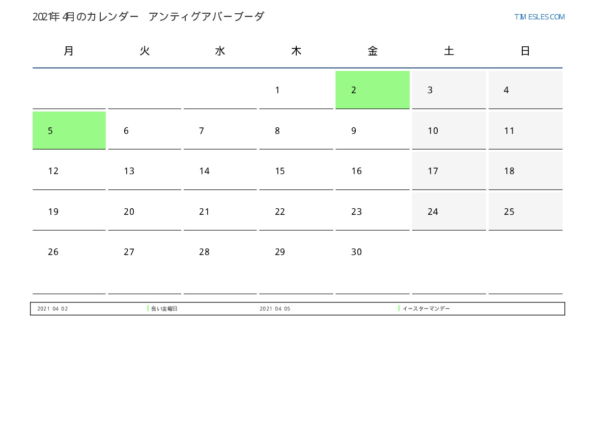 アンティグアバーブーダ2021年4月のカレンダー