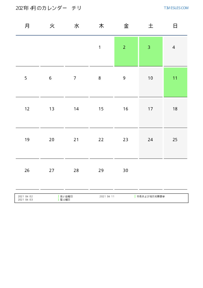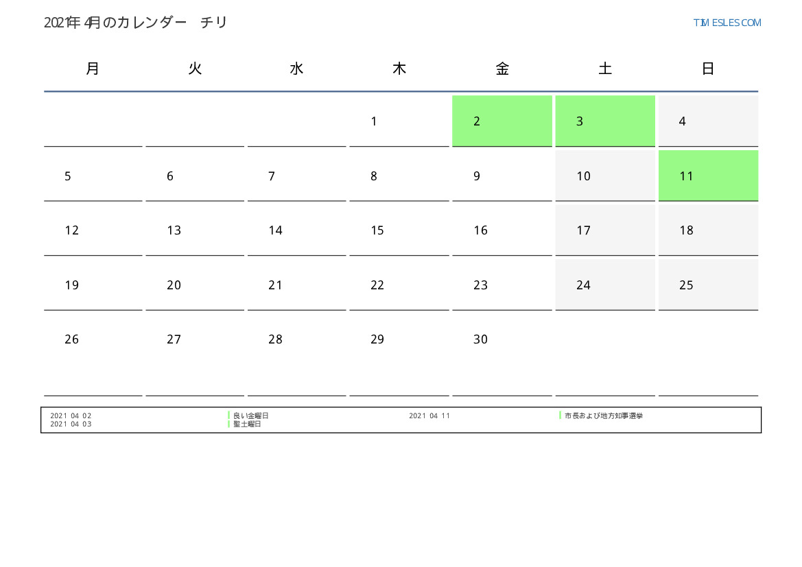チリ向け2021年4月の休日と週末のPDFカレンダーをダウンロードして印刷します