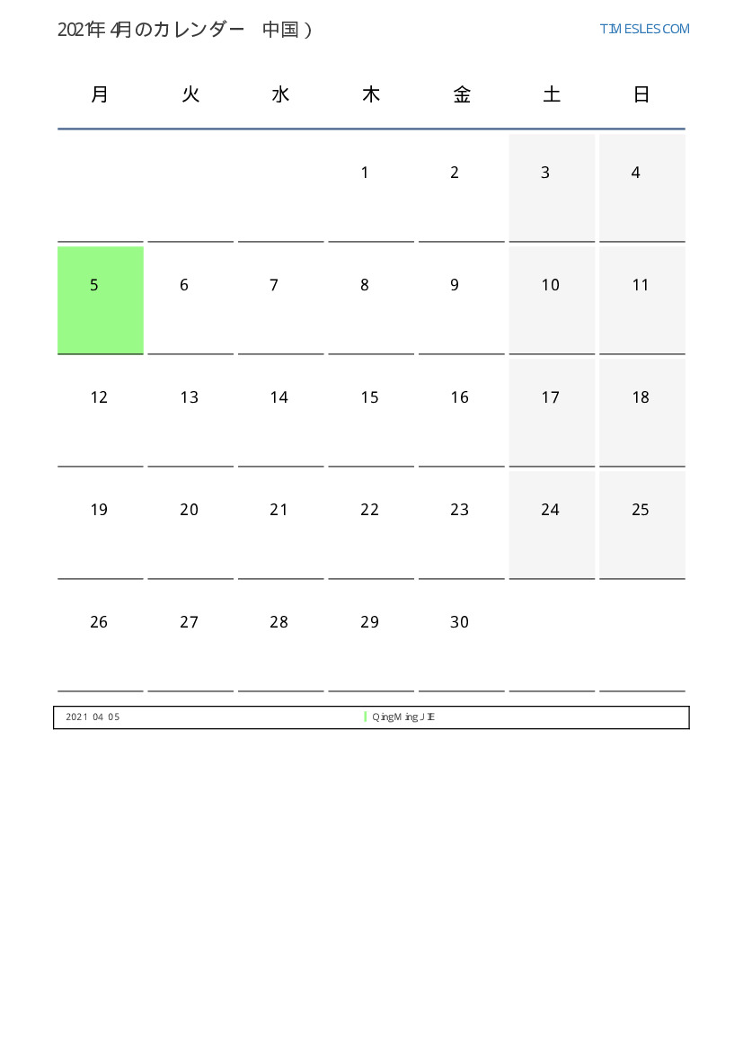 中国向け2021年4月の休日と週末のカレンダー