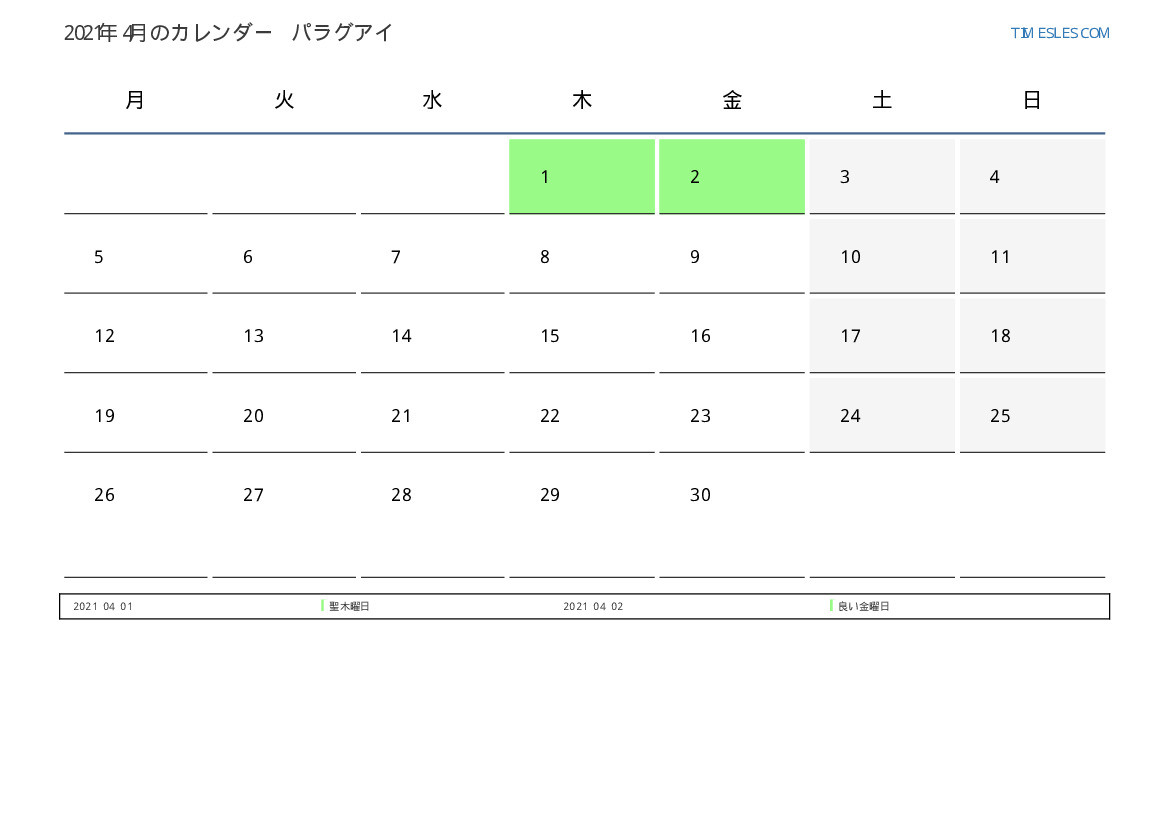 パラグアイ向け2021年4月の休日と週末のカレンダー