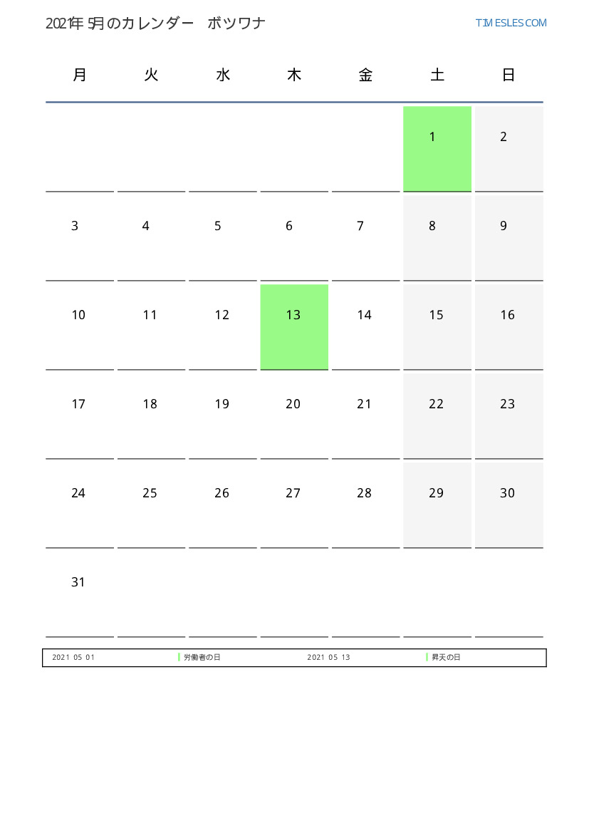 ボツワナ向け2021年5月の休日と週末のカレンダー