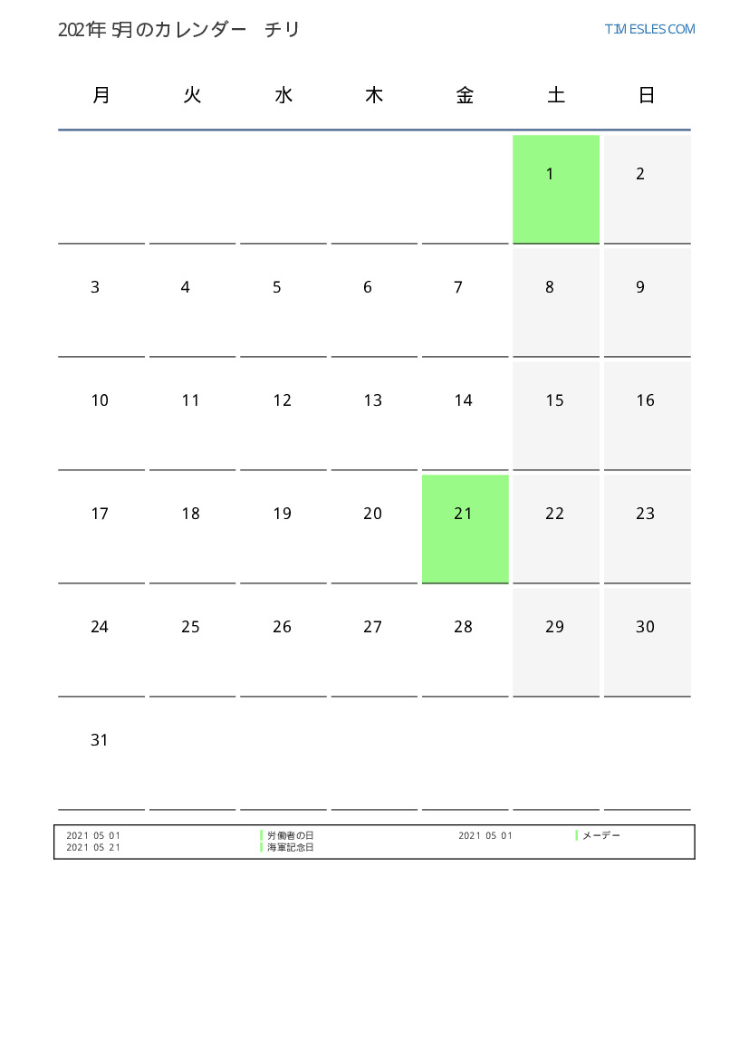 チリ向け2021年5月の休日と週末のPDFカレンダーをダウンロードして印刷します