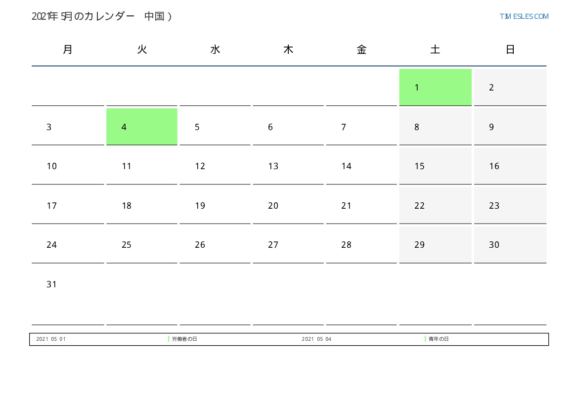 中国向け2021年5月の休日と週末のPDFカレンダーをダウンロードして印刷します