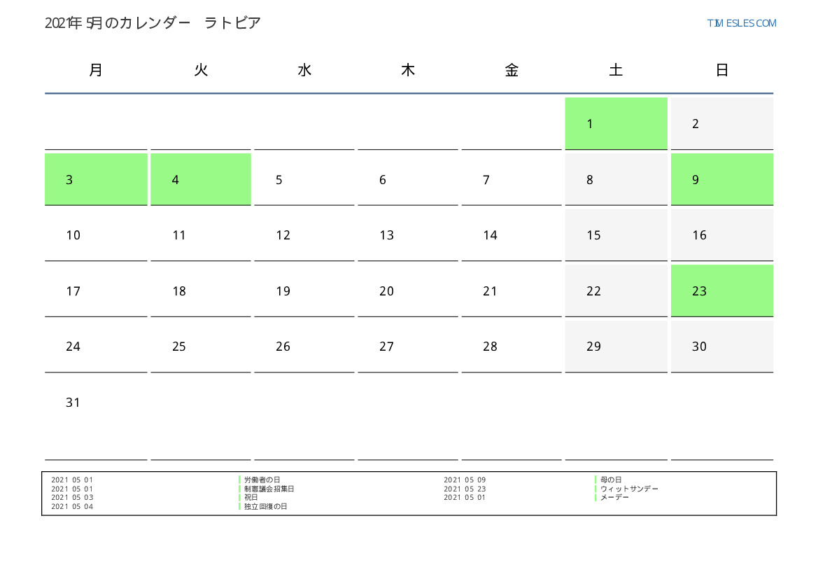 ラトビア向け2021年5月の休日と週末のカレンダー