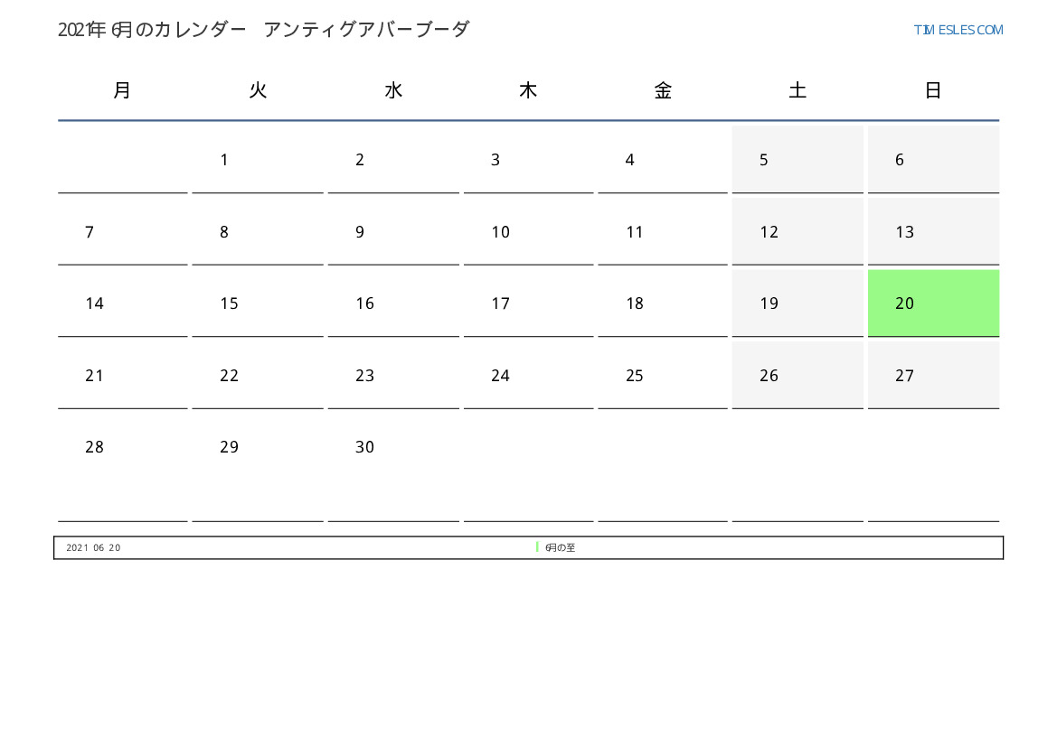 アンティグアバーブーダ2021年6月の休日と週末のカレンダー