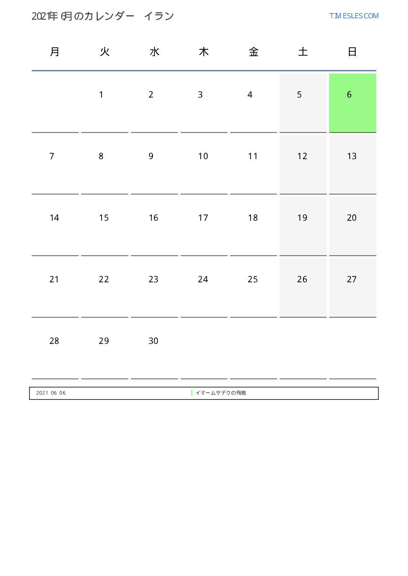 イランのために2021年6月の休日と週末のPDFカレンダーをダウンロードして印刷します