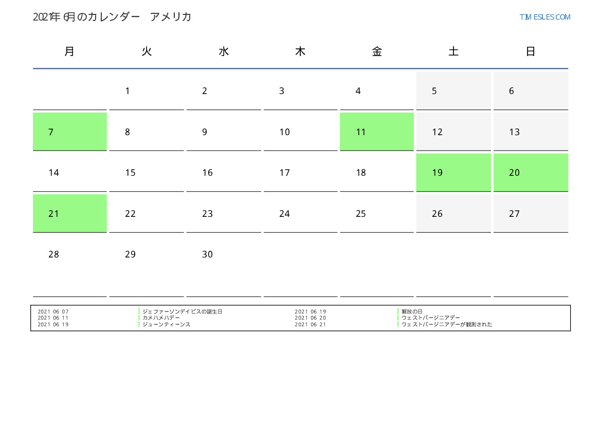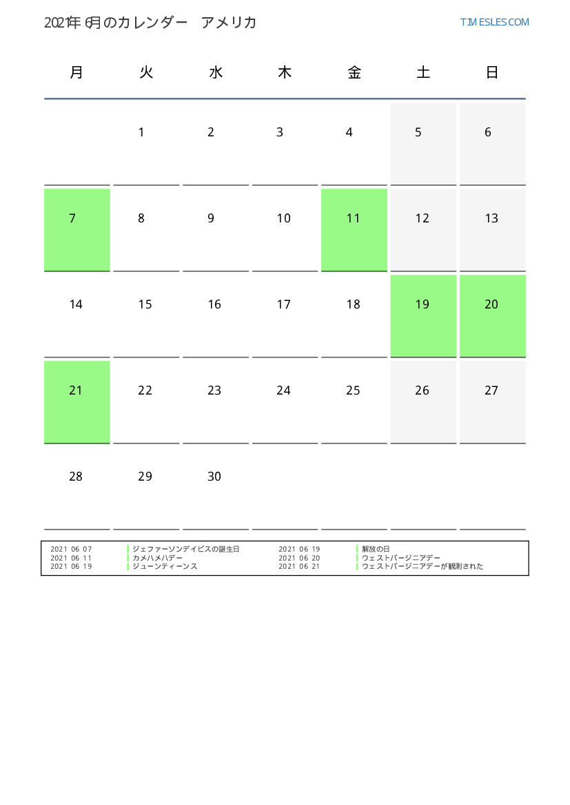 米国向け2021年6月の休日と週末のカレンダー