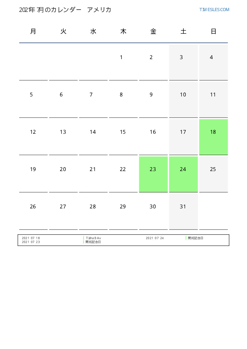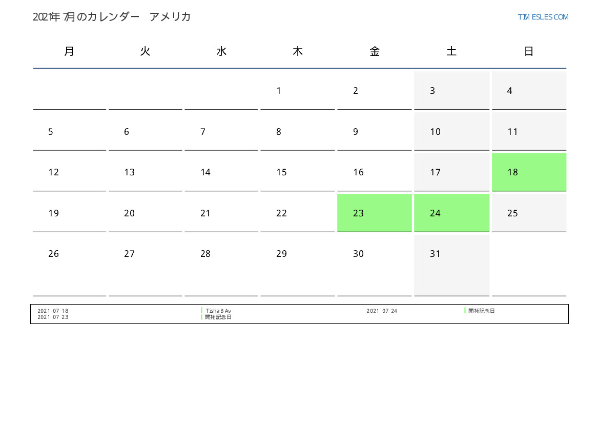 米国向け2021年7月の休日と週末のPDFカレンダーをダウンロードして印刷します