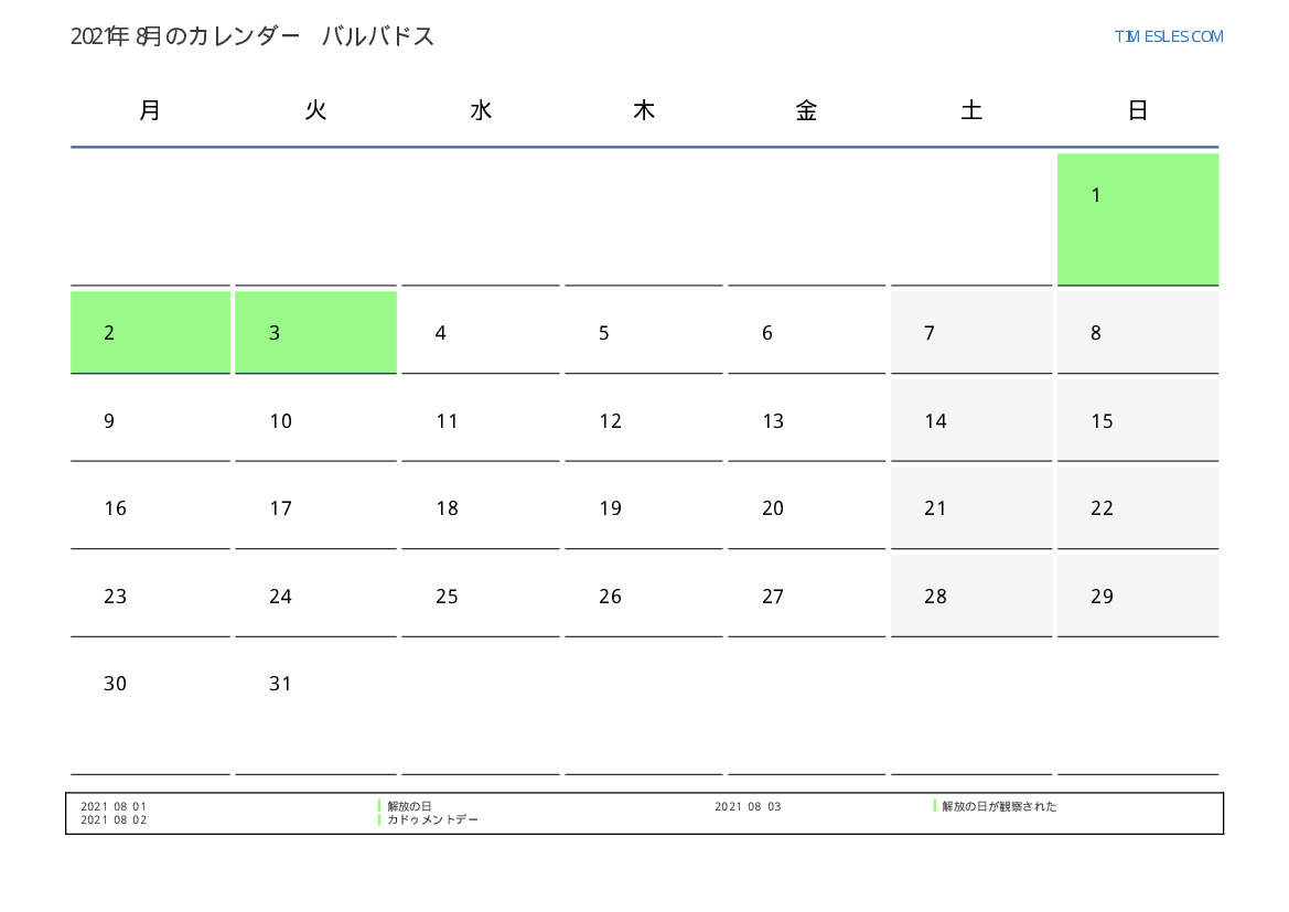 バルバドスのために2021年8月のカレンダー