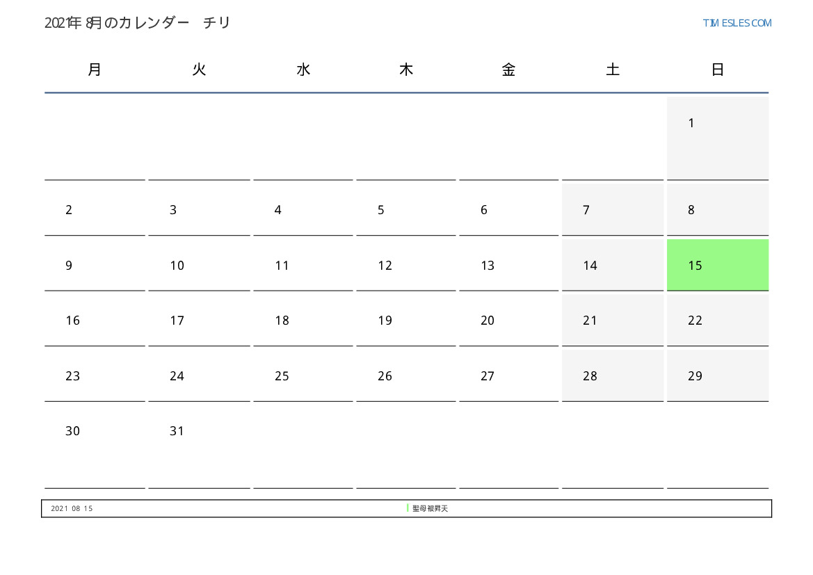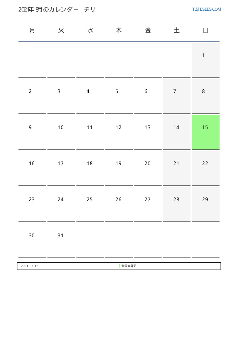 チリ向け2021年8月の休日と週末のPDFカレンダーをダウンロードして印刷します