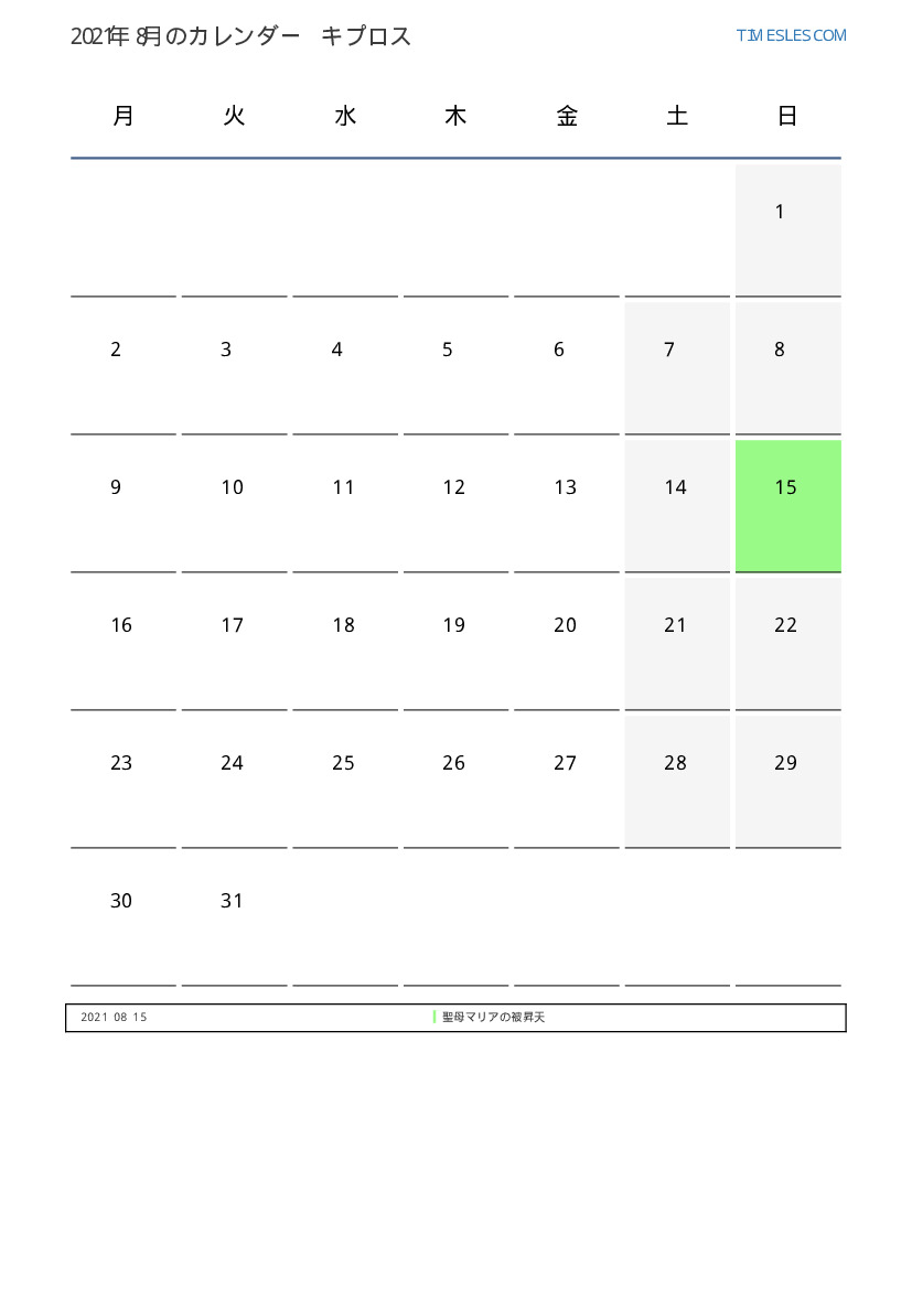 キプロス向け2021年8月のカレンダー