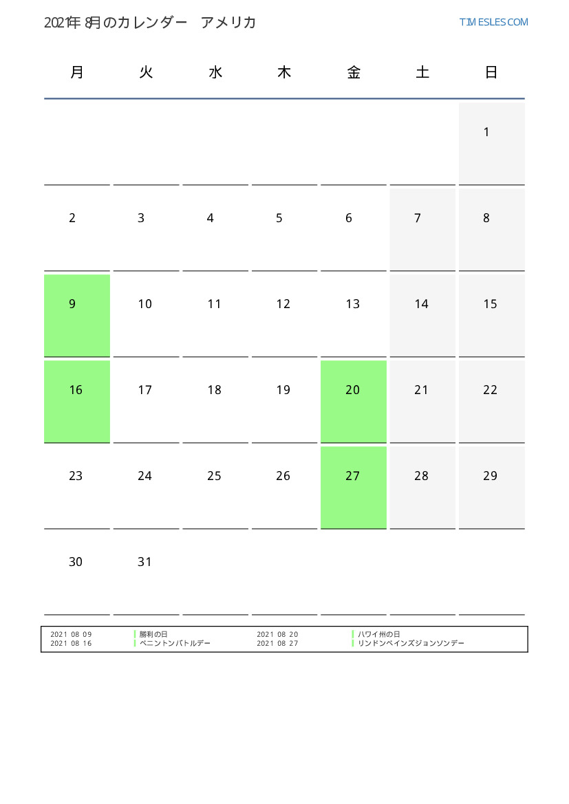 8月には31日が含まれます。 これは2021年の8か月です。一年の季節:夏。 8月は日曜日に始まり、火曜日に終わります。 2021年8月、アメリカ合衆国では20 休日と休日があります。