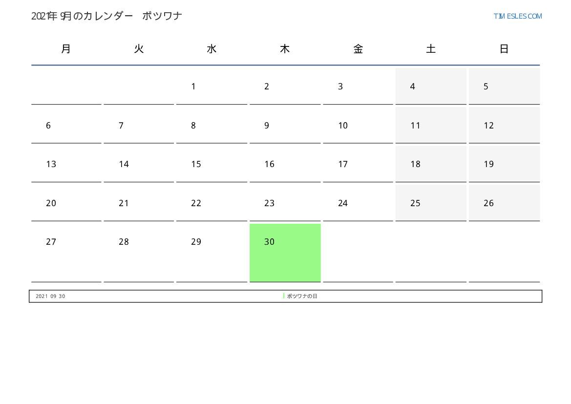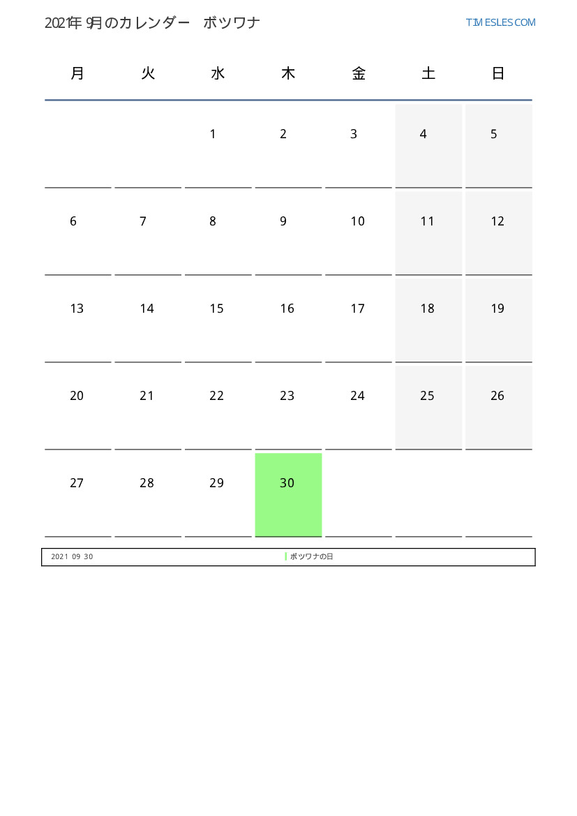 ボツワナ向け2021年9月の休日と週末のカレンダー