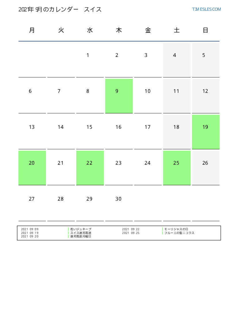 スイス向け2021年9月のカレンダー